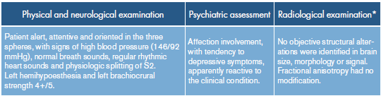 In January 201 7, the patient was referred for assessment by the interdisciplinary neurosciences team of the Universidad Nacional de Colombia (neurology, neuropsychology, phonoaudiology, internal medicine, psychiatry and neuroradiology). The results are detailed in Table 1.