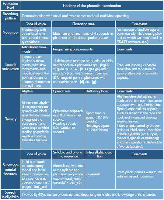 In this case, there was also evidence of fluctuations in the tone of the voice with occasional tonal breaks and variations in intensity; intrasyllabic duration and frequency of intrasyllabic pauses were increased, similar to what the literature reports. 32,33,43 Articulatory movements were imprecise, slow and with changes in the point and manner of some phonemes and syllables.