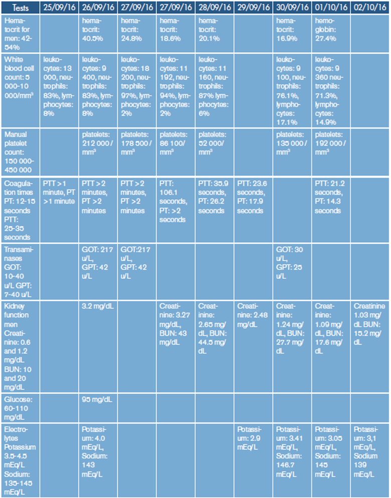 During the night, a new transfusion of red blood cells was made. However, the patient showed no signs of hemodynamic instability and his neurological state was preserved. Correction of acute anemia, preserved kidney function, correction of hypokalemia, preserved coagulation times and corrected thrombocytopenia were observed; there was no evidence of bleeding in the gums. He was finally discharged to continue medical treatment and care on an outpatient basis.