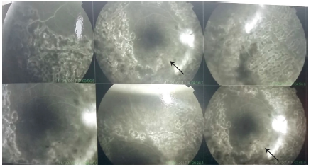 Figure 1: Findings of fluorescein angiography in the right eye. → Fibrovascular proliferation in the area of the optical disc and in the lower area.