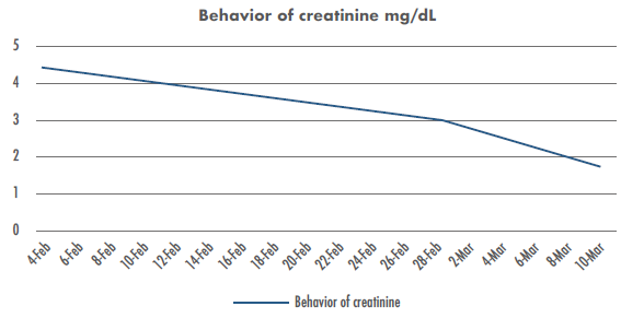 Considering the acute renal injury with proximal and distal tubular involvement, the history of tuberculosis and that rifampicin is the most frequently involved drug in kidney failure in this type of cases 8, treatment was suspended and a kidney biopsy was indicated to confirm the origin of the failure and plan a treatment. After the suspension of rifampicin, azotemias improved until creatinine was normalized (Figure 1).