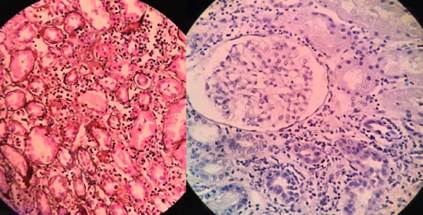 Kidney biopsy confirmed acute tubuloint- erstitial nephritis (ATIN) with inflammatory cells, eosinophils, and interstitial edema. The findings were also suggestive of drug hypersensitivity with associated tubular injury (Figure 2).