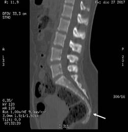 Figure 1: Lumbosacral spine CT showing sacrococcygeal dislocation.