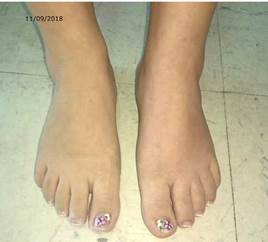 During the second week of hospitalization, the patient presented radicular pain in the lower left limb, minimal sensory changes in the left L5-S1 segment (partial objective difference in distal S1 strength and minimal difference in ipsilateral L5), sensory alteration of the lower left limb (from L5 to S1) and changes in temperature, hypostesia, allodynia and coloration in the dorsum of the left foot (Figure 2).