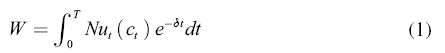 , para i = 1, 2,...N. Ahora, para T períodos de tiempo y con una población constante, el bienestar actualizado (en valor presente) en una versión continua está dado por la ecuación (1):