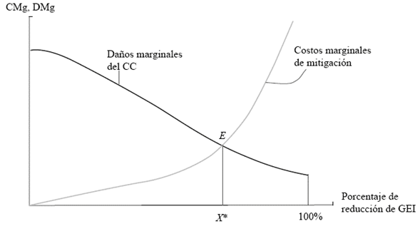 Gráfica 1: Costo marginal de la reducción de GEI y el daño marginal del calentamiento global.