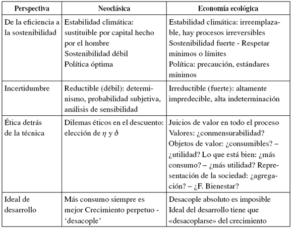 El artículo realiza un aporte en el análisis de aquellos elementos en los cuales difieren las dos perspectivas teóricas a propósito del CC, y apuesta por un giro hacia la economía ecológica. Esta perspectiva teórica resulta más apropiada para abordar el reto que representa el CC por varios motivos (véase Tabla 1), pero principalmente porque su marco analítico permite capturar elementos como la sostenibilidad fuerte y la incertidumbre irreductible. En el fondo, al asumir esta visión teórica se abre la puerta a una discusión normativa sobre el deber ser del mismo proceso económico, cuestionando el papel del crecimiento económico como generador de bienestar y así como la base del concepto de desarrollo.