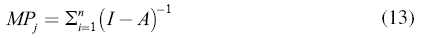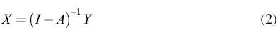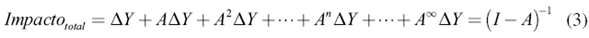 Donde I es la matriz identidad. La matriz (I-A) se conoce como matriz de Leontief, mientras que la matriz (I-A)-1 se denomina matriz inversa de Leontief y cada una de sus celdas denota los requerimientos totales (directos e indirectos) en la obtención de la producción de cada sector. Entonces, (I-A)-1 recoge el efecto multiplicador de un cambio exógeno en la demanda final, lo que puede expresarse como: