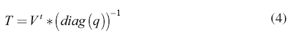 Donde Vt corresponde a la transpuesta de la matriz oferta y q a un vector columna de dimensiones n x 1 que se deriva de la misma matriz. Cada fila de este vector contiene el total de la oferta de cada producto.