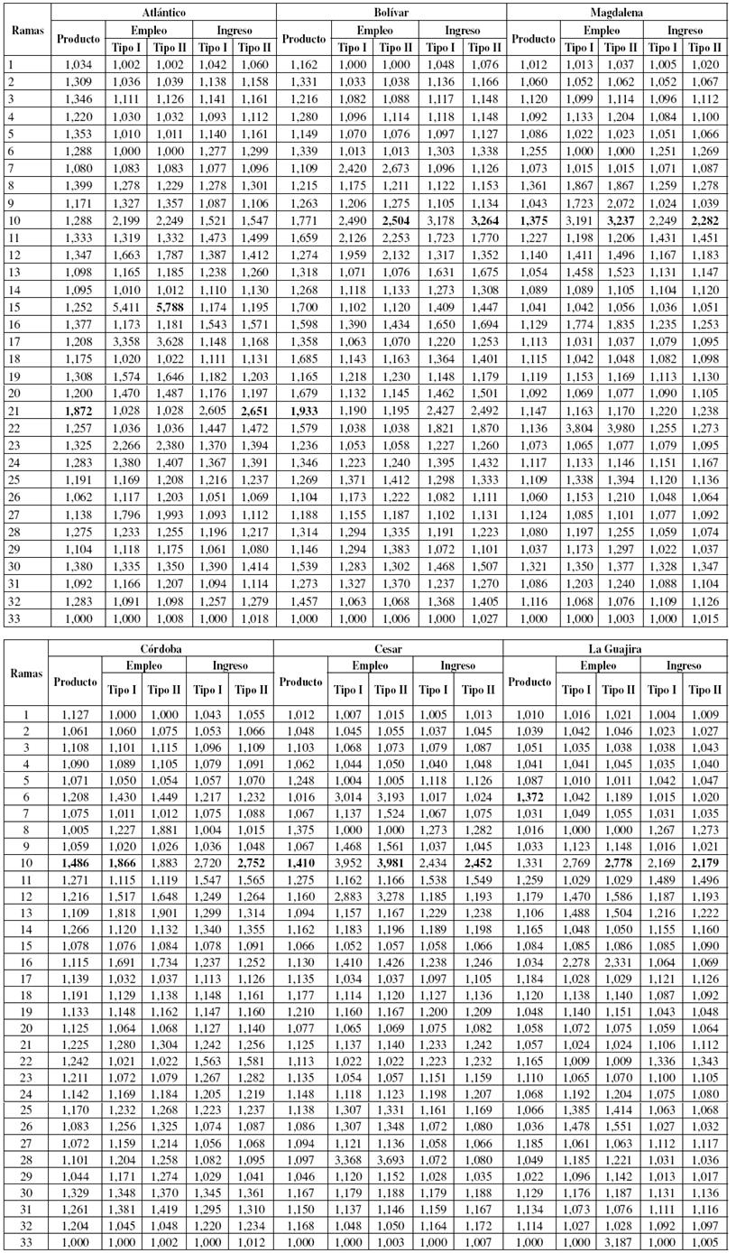 Multiplicadores insumo-producto, departamentos del Caribe colombiano