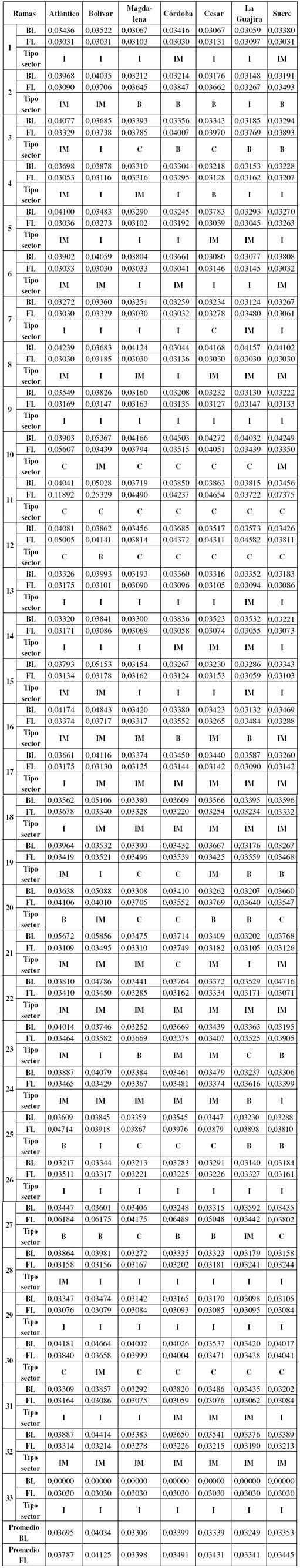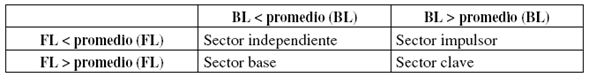 Por tanto, (25) y (26) llevan a determinar el valor del vínculo hacia atrás y hacia adelante, respectivamente, de cada rama productiva. Con esta información, es posible clasificar a los sectores como lo propone la Tabla 1.