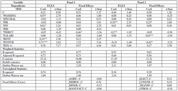 Se verifica que no todas las variables consideradas en la investigación son determinantes de la IED, toda vez que influyen de manera distinta en los dos paneles.