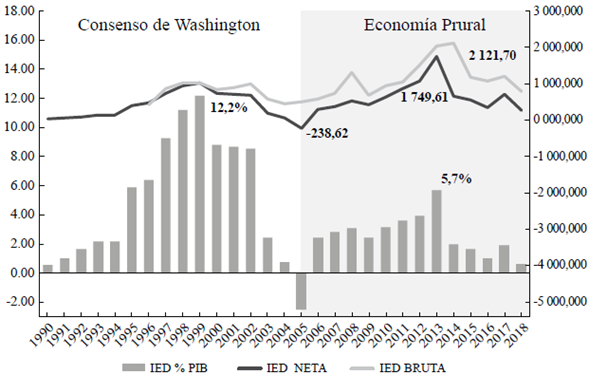 La IED bruta ha tenido un comportamiento similar al de la IED neta, a excepción del periodo de atracción de capitales por la implementación de las políticas del Consenso de Washington. En Bolivia, estas fueron efectuadas mediante la capitalización de la mayoría de las empresas públicas y un conjunto de reformas de segunda generación, iniciadas en esos años que determinaron un contexto en el que no se tiene retiros de capital ni ventas de acciones. Por ello, la IED bruta, salvo por amortizaciones, es prácticamente igual a la IED neta.