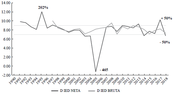 La variación interanual de la IED neta ha estado en el intervalo ±50 %, a excepción de algunos periodos, entre los que resaltan el de 1995, cuyo crecimiento fue de 202 %, y el de 2005, que tuvo un decrecimiento de 465 % (Figura 2).
