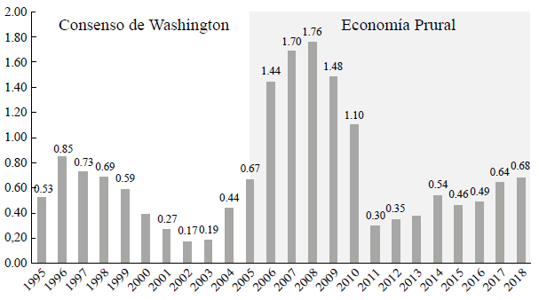 También resalta que la economía boliviana en el contexto del Consenso de Washington comenzaba a volverse altamente dependiente de la IED, pues, al momento de mayor influjo de capitales extranjeros, estos representaron el 12,2 % de la economía; mientras que el mayor influjo de capital extranjero en la economía plural solo representó el 5,7 %. En ambos periodos se acumuló IED neta por un monto de 14 513 millones de USD; en promedio los flujos significaron el 4 % del PIB, con una tasa de crecimiento promedio de 8 % (Figura 1).