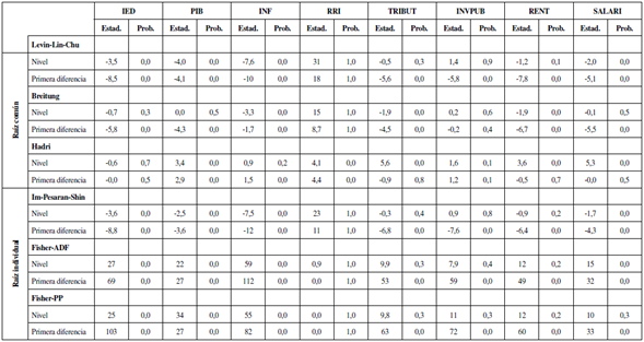 Las pruebas de raíces unitarias para paneles de datos parten del supuesto de que las series de tiempo de las unidades económicas de un panel han sido generadas por un proceso autorregresivo. La clasificación de las distintas pruebas puede realizarse en función de las características de ese proceso. La primera aproximación consiste en asumir que los coeficientes son comunes a todas las unidades de sección cruzada, para lo cual se utilizarán las pruebas de Levin-Lin-Chu, Breitung y Hadri, pues permiten considerar parámetros comunes en la prueba de estacionariedad. La alternativa consiste en permitir que los coeficientes varíen libremente entre las diferentes unidades, vale decir procesos individuales, para lo cual recurrimos las pruebas Fisher-ADF, Im-Pesaram-Shim y Fisher-PP, que operan considerando que el coeficiente autorregresivo varía libremente alrededor de todas las unidades de sección cruzada.
