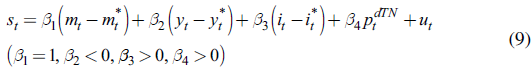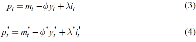 Donde m t es el logaritmo natural de la demanda de dinero doméstica; p t el logaritmo del nivel de precios internos; ү t el logaritmo del nivel de ingreso real doméstico e i t es la tasa de interés nominal interna. El asterisco indica que las variables corresponden al exterior, en las respectivas variables de la demanda de dinero. El parámetro ф mide la elasticidad de la demanda de dinero con respecto al ingreso, mientras que λ es la semieleasticidad con respecto a la tasa de interés. Así, la demanda de dinero, en términos reales, está relacionada directamente con el ingreso real y guarda una relación negativa con la tasa de interés.
