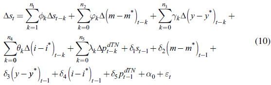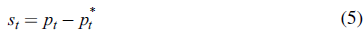 Las anteriores ecuaciones corresponden a una especificación monetarista del nivel de precios, determinado por el exceso de oferta monetaria. Ahora, asumiendo la hipótesis de PPP en su versión absoluta, que define al tipo de cambio como la relación de precios internos y externos2, se obtiene la ecuación (5):