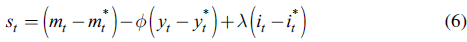 Sustituyendo las ecuaciones (3) y (4) en la ecuación (5), asumiendo que los coeficientes cumplen la condición de homogeneidad, es decir que la elasticidad ingreso y la semielasticidad de la tasa de interés son iguales en ambos países (ф = ф* , λ = λ*), se obtiene el modelo monetario para el tipo de cambio que se muestra en la ecuación (6) (MacDonald y Taylor, 1992).