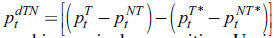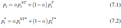 A fin de incorporar el impacto de factores reales en la trayectoria del tipo de cambio. Se asume que los niveles de precios domésticos y externos se definen como el promedio ponderado de los precios transables5 (p t T ) y no transables p t NT . Así ocurre también para el caso de los precios domésticos6 y precios externos, en su forma lineal logarítmica, según se muestra en las ecuaciones (7.1) y (7.2) (Civcir, 2003; Crespo et al, 2005).