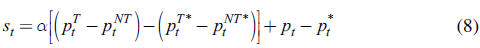 Se define que el tipo de cambio nominal está determinado por la relación de los precios doméstico y externo, en el sector de bienes transables s t = p T* t - p T t . Ahora, de las ecuaciones (7.1) y (7.2) se despejan los precios del sector transables, se sustituye en la ecuación de tipo de cambio y, reordenando, se obtiene la ecuación (8) (Civcir, 2003; Clements y Frenkel, 1980).