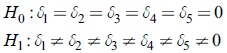 Es importante señalar que los coeficientes δ i ., asociados a las variables en niveles con un rezago, representan los multiplicadores de largo plazo, que permiten estimar la ecuación de cointegración al normalizar con respecto a δ i , es decir, con respecto al coeficiente del tipo de cambio en nivel de un periodo anterior. En este sentido, la prueba de cointegración propuesta por Pesaran et al. (2001), consiste en verificar la significancia estadística de los multiplicadores de largo plazo por medio de una prueba F, esto es de la siguiente forma: