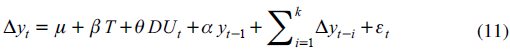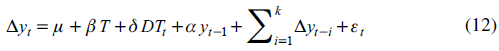 El segundo incluye una dummy de tendencia, DT t = t - T b , que busca aproximar el cambio en la tendencia y se conoce como modelo B (ecuación 12).