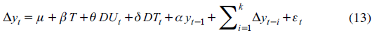 Finalmente, el modelo C incluye tanto un cambio de nivel como cambio en la tendencia, como se representa en la ecuación (13).