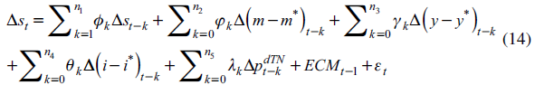 Una vez normalizados los coeficientes de las variables en niveles con respecto al tipo de cambio, se obtiene la ecuación de cointegración (ecuación 15).
