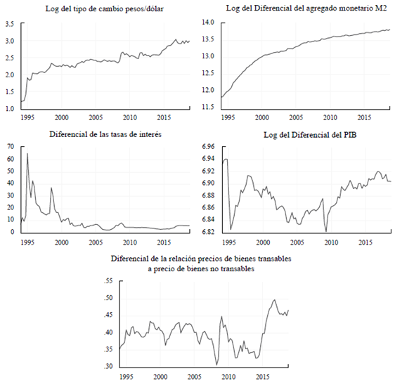 La base de datos utilizada es información trimestral desde 1994q1 a 2018q4, considerando país externo a la economía de los Estados Unidos. Así, se incluye el tipo de cambio nominal (s t ) pesos por dólar de Estados Unidos (USD); la cantidad de dinero se aproximó por los agregados monetarios M2 para ambos países (mt, m*); como variable de ingreso se utilizó el PIB en términos reales (yt, y* t); la tasa de interés doméstica (it) corresponde a los CETES a 91 días y la tasa de interés externa se define por la tasa de las letras del tesoro de los Estados Unidos a tres meses (i* t).