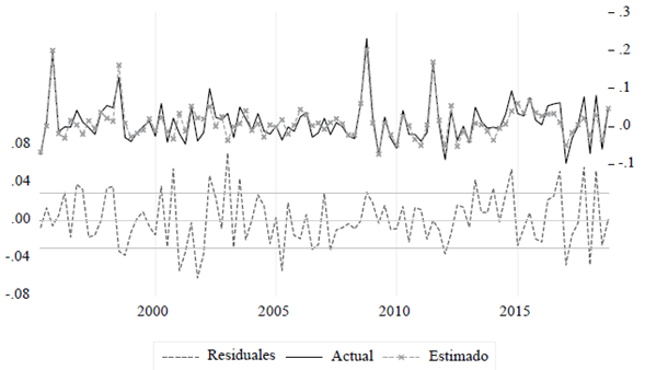 Además, los estadísticos de ajuste reportan que los valores estimados por el modelo representan satisfactoriamente los valores observados de las variaciones del tipo de cambio con un grado de ajuste de 72 % (Figura 2). El periodo relevante para la economía mexicana es a partir de la adopción de un régimen flexible de tipo de cambio, en el contexto de un esquema de metas de inflación. En ese contexto, el mercado de capitales y, sobre todo, la diferencia entre los rendimientos domésticos y externos son una referencia en la formación de expectativas cambiarías, y el modelo reproduce adecuadamente la dinámica de corto plazo del tipo de cambio nominal.