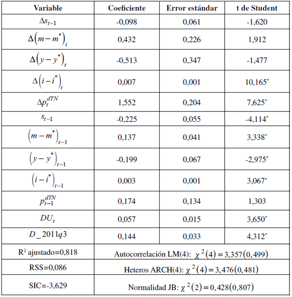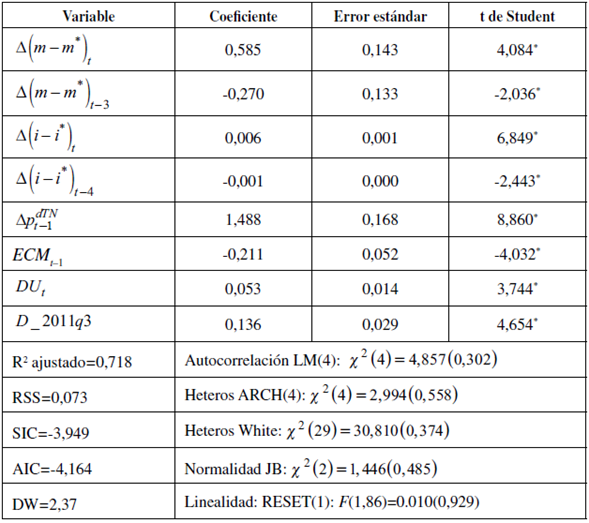 La Tabla 5 presenta los resultados de la estimación del modelo de corrección de errores. Las pruebas de diagnóstico indican que los errores del modelo econo-métrico final no presentan problemas de autocorrelación ni heterocedasticidad, y se distribuyen como una función de densidad de probabilidad normal. Es decir, no contienen información sistemática que deba ser incorporada en el modelo. En tanto que el mecanismo de corrección de errores (ECMt-1) es negativo y estadísticamente significativo. Por tanto, los desajustes en la relación de equilibrio son incorporados en la modelación de corto plazo, con una velocidad de ajuste del modelo de 21 % para cada trimestre.