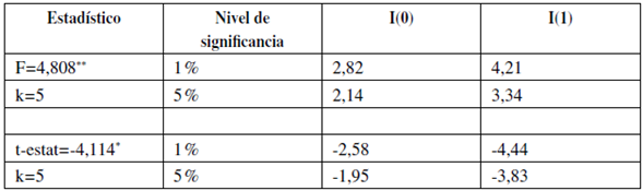 Nota: los símbolos ** y * significan rechazo de la hipótesis nula de no cointegración al 1 % y al 5 % de significancia, respectivamente. Valores críticos para el estadístico F, tabla CI(i); y para el estadístico t de Student tabla CII(i) (Pesaran et al., 2001). Fuente: elaboración propia.
