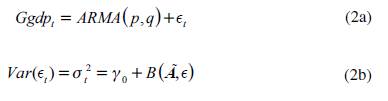 En los modelos ARCH (Engle, 1982), la varianza condicional se obtiene del proceso de los errores al cuadrado autorregresivos. Con los modelos TARCH (Zakoian, 1994), se identifican noticias negativas o, para esta investigación, señales de crisis económicas que afectan la volatilidad. Finalmente, con los modelos GARCH (Bollerslev, 1986), la predicción de la varianza condicional se incorporan varianzas condicionales de periodos previos. Los modelos de crecimiento económico de series de tiempo (Ggdp,), sin variables explicativas, con tres tipos de varianza condicional, se especifican en la ecuación (2):