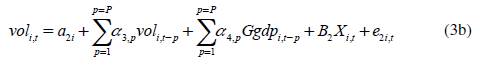 En el marco de los modelos de crecimiento y volatilidad económica, proponemos la especificación de la primera ecuación (1a) del sistema, donde la tasa de crecimiento del PIB actual (Ggdp¡ t ) se determina por la volatilidad económica previa (vol ¡,t-1 ). Para la segunda ecuación (1b), la volatilidad actual (vol ¡,t-1 ) está condicionada por el crecimiento económico previo (Ggdp¡