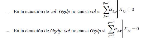 La especificación permite analizar diferentes aspectos de la vinculación entre la volatilidad y el crecimiento económico: si los parámetros alfa (α 1 y α 2) son significativos, entonces existe doble causalidad. Cuando α 1 # α 2= 0, entonces la volatilidad causa al crecimiento económico. En el caso contrario, donde α 1 = α 1 # 0, entonces el crecimiento causa volatilidad económica. Con causalidad individual el signo del parámetro es suficiente para concluir si la relación es negativa o positiva, pero con doble causalidad la relación negativa o positiva predominante se obtiene por la suma de los parámetros alfa y por las modificaciones en las condiciones iniciales del equilibrio en el sistema.