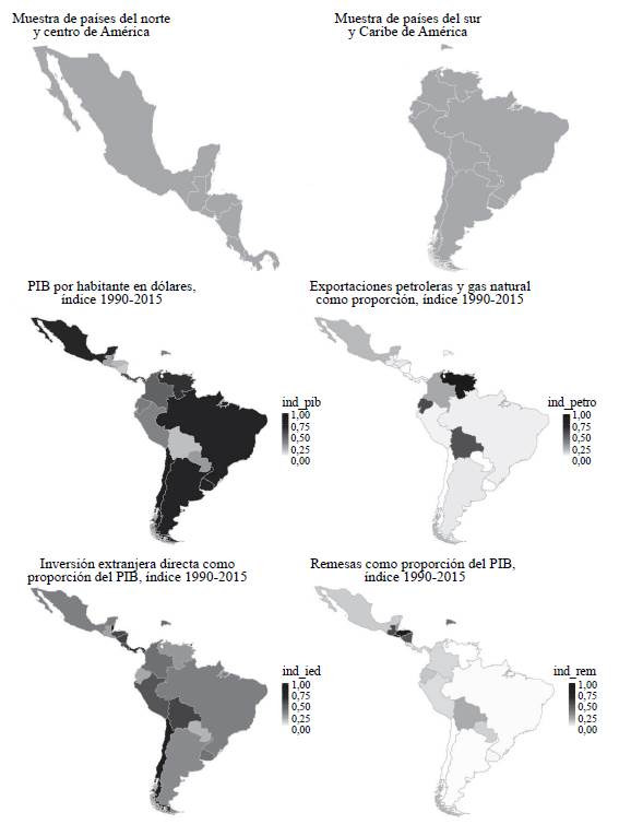 Para mostrar las características económicas de la muestra de países, los indicadores promedios del periodo 1990-2015 fueron transformados en índices estandarizados entre cero y uno, con la división del indicador entre el rango (máximo menos cero). En los mapas de la distribución de los indicadores entre los países de la muestra de la Figura 1 se presentan en tono gris los valores de cada indicador, con punto de inflexión en valores igual o mayor que 0,7, con el objetivo de identificar grupos de países en la distribución del índice. Con el PIB por habitante, se muestra que seis de los veinte países de la muestra presentan los niveles más altos, donde destacan, en orden de importancia, Chile, Uruguay, Brasil, Argentina, México; y el caso especial de Trinidad y Tobago. En contraste, la mayoría de los países con niveles de ingreso por habitante bajos se localizan en Centroamérica y Bolivia, en Suramérica.