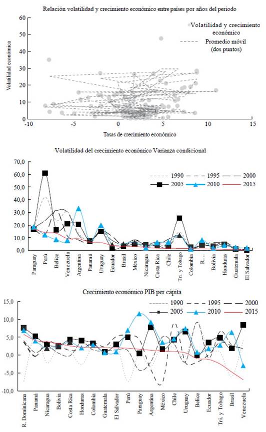 La evidencia (Figura 2) indica que la mayoría de los países de América Latina transitó por periodos de baja volatilidad en 1990, mayor volatilidad en el 2000 y relativa estabilidad económica en 2010-2015. Es importante mencionar que de los países con mayor reducción de su volatilidad económica al final de periodo fueron Paraguay, Perú, Belice, Venezuela, Argentina, Uruguay y Trinidad y Tobago. Por el lado de la dinámica económica resalta que el mejor desempeño al final del periodo se concentró en países de menor ingreso por habitante de Centroamérica, Suramérica y el Caribe, y crecimientos económicos muy parecidos entre ellos de 1990 a 2015.