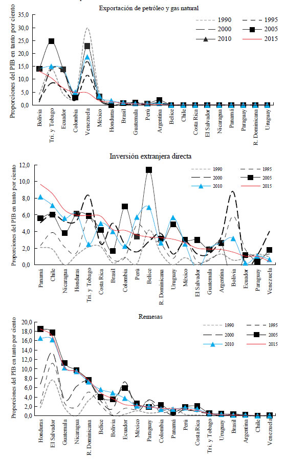 Las tendencias de los recursos externos por petróleo y gas natural, por IED y remesas, son muy diversas en los países de América Latina. Los recursos externos por la venta de gas natural predominan en Bolivia y Trinidad y Tobago; para Bolivia la relevancia económica es cada vez mayor; mientras en Trinidad y Tobago la tendencia ha sido decreciente (Figura 3). Las exportaciones de petróleo como proporción del PIB son prácticamente las mismas de los últimos 30 años en Colombia y México. Ecuador ha logrado reducir su dependencia como parte de una estrategia, pero en Venezuela, de contar con grandes recursos externos por sus exportaciones petroleras en 1990, en la actualidad dispone de recursos equivalentes al 5 % del PIB; principalmente, por la reducción de los precios del petróleo.
