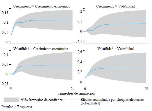 El análisis de impulso-respuesta se obtuvo simulando un choque aleatorio equivalente a una desviación estándar de las innovaciones de la volatilidad y el crecimiento económico que cumplen con ser independientes. Esta condición surgió de escribir el sistema de ecuaciones 3 de acuerdo con la solución de equilibrio