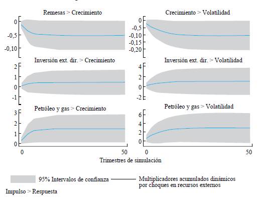 Con los resultados del modelo ocho, se elaboró la simulación para el análisis de impulso-respuesta de multiplicadores dinámicos, donde se consideró que los recursos externos por exportaciones petroleras y gas natural, la inversión extranjera directa y las remesas afectan la relación volatilidad y crecimiento económico. Para el diseño de las simulaciones, se estableció un escenario con horizonte de cincuenta trimestres de predicción y cien repeticiones de Monte Carlo para los intervalos de confianza. Dado que las condiciones de convergencia (||λ nxp||< 1) se cumplieron en todos los modelos estimados (Tabla 3), los resultados de las simulaciones para el análisis impulso-respuesta y multiplicadores dinámicos se presentan en términos de multiplicadores acumulados que convergen a los nuevos equilibrios de largo plazo.