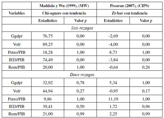 Para revisar las características estocásticas de las variables de crecimiento y volatilidad económica, como los recursos externos petroleros, inversión extranjera directa y remesas previo a la estimación de modelos de volatilidad y panel-VAR, se aplicó el análisis de integración con los estadísticos de Maddala y Wu (1999) y Pesaran (2007), para probar de raíces unitarias con procesos individuales en datos panel. Las pruebas de raíz unitaria se aplicaron para seis y doce rezagos, con el objetivo de detectar las restricciones dinámicas para asegurar que las variables cumplen con la condición de ser estacionarias de orden cero.