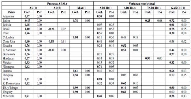Con respecto a los procesos de varianza condicional relevantes, se encontró que, en la mayoría de los países, se definía por comportamientos simétricos del tipo ARCH(1); en segundo lugar, la parte GARCH(1), y tercer lugar los ARCH(2). Para Belice y Honduras, fueron relevantes los procesos TARCH(1), que indican comportamientos asimétricos (leverage), donde los momentos accedentes del ciclo económico (buenas noticias); y 1,i resultaron cero en Belice y 0,14 en Honduras; y los momentos de crisis económicas (malas noticias), medidos por y 1,i,- + y 2,i, fueron de 0,25 para Belice y 1,1 en Honduras; y en los dos casos, resulta con mayor intensidad los sucesos de alta volatilidad con crisis económicas (Tabla 2).