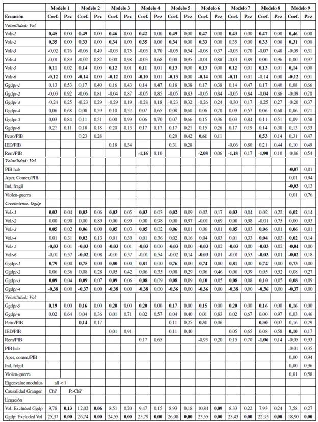 Los resultados de la estimación del modelo panel-VAR 8 (Tabla 3) indica que las exportaciones petroleras y gas natural, junto con la IED, causan mayor volatilidad y crecimiento económico, en tanto las remesas reducen la volatilidad a costa de menor crecimiento económico.