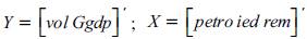 es el vector de las variables exógenas de exportaciones petroleras (petro), inversión extranjera directa (ied) y remesas (rem) respectivamente; u