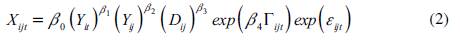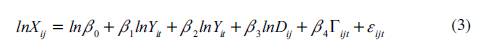 Donde X ijt es el comercio entre los países i y j en el año t; Y ij es el producto (o producto per cápita) de los países i y j en el año t; D ij es la distancia entre el país i y el país j; Γ ijt es un vector de variables explicativas adicionales (barreras físicas y condiciones de política); y ε ijt es el error, normalmente distribuido, con media cero.