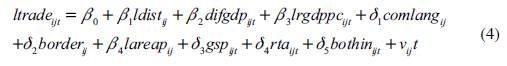 Por su parte, Bolívar et al. (2015) lo usaron con el propósito de dar soporte a una serie de consideraciones económicas, culturales, político-administrativas y geográficas que se deben tener en cuenta para formular políticas a futuro en Colombia. La presente investigación lo emplea para cuantificar el aumento o reducción de comercio a partir de la entrada en vigor del TLC entre Colombia y Estados Unidos. Para ello, se adoptan algunos elementos de la ecuación gravitacional definida por Rose (2004) y se determina el modelo gravitacional de comercio para Colombia como un modelo panel (ecuación 4).