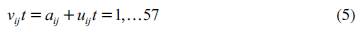 v ij t = α ij + u ij t es la fórmula del término error, compuesto por α ij que son los factores no observados invariantes en el tiempo y el efecto individual, por ejemplo, las capacidades innatas de los países o sus factores históricos e institucionales. Para controlar estos factores inobservados se usan efectos fijos sujetos al par de países.