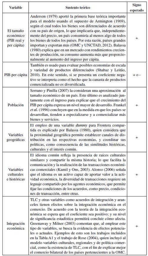 Tabla 1: Variables principales del modelo gravitacional y su sustento teórico