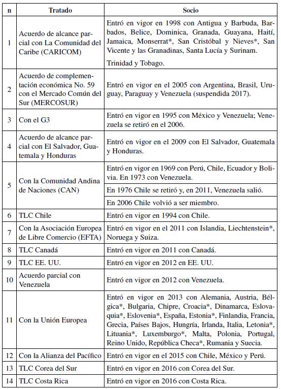 rta ¡jt es una variable categórica que puede tomar valores de 0 a 14. Cada valor corresponde a un tratado comercial vigente de Colombia (aunque hay diferentes formas de integración comercial se usará "tratado comercial" como un descriptor genérico). Toma el valor n si el socio con el que comercia Colombia en el año t forma parte del tratado suscrito con el país (Tabla 2).